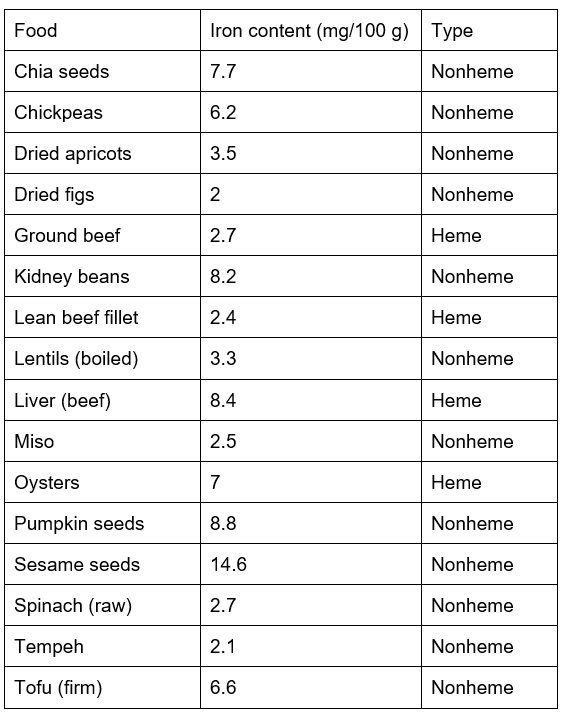 Two types of iron coexist in nature: heme iron and non-heme iron. All vegetable sources contain the nonheme form, which is poorly absorbed and utilized by our body. Heme iron is bound to hemoglobin and myoglobin (in muscles) and found in animal sources (mainly beef and liver). About 10% to 30% of ingested heme iron is absorbed. There is good evidence that combining heme and nonheme foods improves the absorption of nonheme iron.